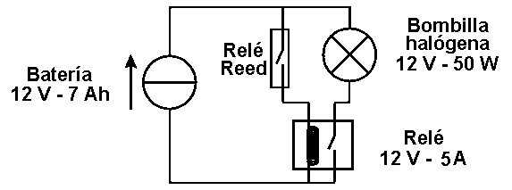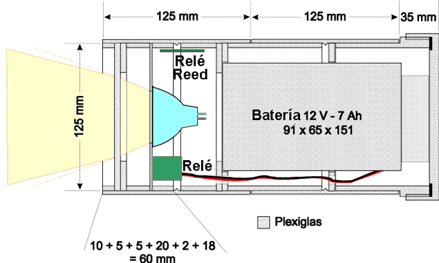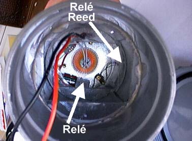 Parte eléctricaConectar la bombilla, el relé Reed (ILS), el relé y la batería según el esquema 5. Para la batería, prever que los cables sean lo suficientemente largos como para abrir la caja y que pueda salir la bateria del interior para recargarla.