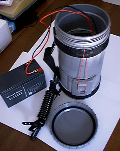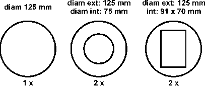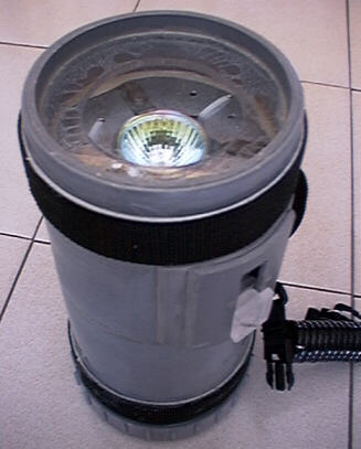 En dos de los cinco discos de plexiglas hay que hacer un orificio de 75 mm. El primero se empleará para reforzar el tubo principal, y el segundo para fijar la bateria y evitar que golpee contra la bombilla. En otros dos discos cortaremos un cuadrado de 91 x 65 mm (o 91 x 70 mm según el tamaño de la bateria). Estas dos piezas mantendrán la bateria en su sitio dentro del tubo. Sugerencia: Para mejorar la solidez del foco, si se unen las dos fundas de PVC con un tubo largo de PVC de 85mm (ver abajo), se deberá reducir el diámetro externo de uno de los discos con agujero rectangular a 116mm.