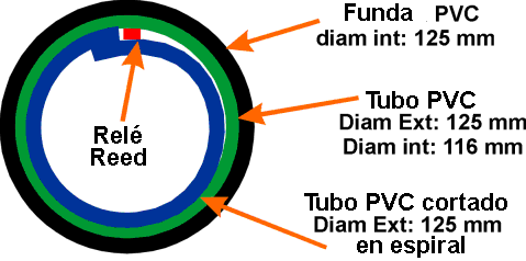 Cortar la parte trasera de la tapa a rosca para que entre 55 mm en la funda. Así, la tapa a rosca deberá sobresalir unos 35mm (ver esquema 1). Para fijar el relé Reed contra el tubo de PVC, se puede cortar un anillo de 50mm del tubo de PVC de 125mm.Abrir el anillo con la sierra e introducirlo en espiral dentro de los anillos de 18 y 30 mm, lo que dejará un espacio para insertar el relé Reed (ver esquema 4).
