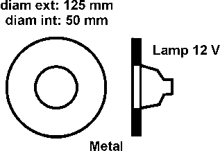 Placa metálicaAhora deberemos cortar un disco de 125mm de diámetro de la placa de metal y realizar un agujero circular de unos 50mm para fijar la bombilla halógena. Si la bombilla lleva un soporte, fijarlo a la placa con dos tornillos o con bridas de nylon.