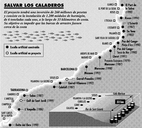 La situación se ha hecho especialmente preocupante en los últimos años, hasta el punto que algunas cofradías, como la de Vilanova i la Geltrú, la tercera base pesquera catalana en capturas, reconocen la necesidad de reducir la presión pesquera sin haber estudiado por ello plan de reconversión alguno. No obstante, y a diferencia de lo que hacen los barceloneses, los pescadores de la flota de arrastre de Vilanova realizan reducciones voluntarias (hasta 780 horas anuales) de los horarios autorizados, que van de las 6 de la mañana a 6 de la tarde de lunes a viernes. La instalación de arrecifes artificiales no es una novedad en Cataluña. Se viene realizando desde 1978 y consiste en el hundimiento de estructuras de defensa que, al dificultar la tarea de las barcas de arrastre, potencia métodos pesqueros más selectivos y menos agresivos con los ecosistemas marinos y sirven como puntos de desove para buen número de especies. El primero de estos arrecifes fue instalado en Arenys de Mar por cuenta del Ministerio de Agricultura, Pesca y Alimentación. En 1986, dos años después de haber asumido competencias en la materia, la Generalitat creó el biotopo de L'Ampolla-Deltebre, que consistió en la colocación de hasta doce arrecifes, con una inversión de 500 millones de pesetas. La Generalitat también ha avanzado notablemente en la construcción de plantas de depuración de las aguas residuales, lo que ha permitido una mejora sustancial de la situación. La barrera artificial protegerá a partir del próximo año una de las concentraciones de fanerógamas marinas más importante del Mediterráneo, magníficas praderas de "Posidonia oceanica", cada vez más escasas en el litoral catalán y de alto valor ecológico por servir como refugio para buen número de especies. En concreto, el ministerio piensa desplegar 33 kilómetros de hormigón entre la cala Morisca de Vallcarca (en Sitges) y el Roc de Sant Gaietà, en Roda de Barà. El proyecto, que supondrá una inversión que rondará los 260 millones de pesetas, consistirá en la instalación, a entre 15 y 33 metros de profundidad, de un total de 1.200 módulos de hormigón de 6 toneladas cada uno, capaces de romper las redes de las barcas de arrastre que intenten pescar en estas zonas protegidas. El secretario general de Pesca Marítima del ministerio, Samuel Juárez, destaca los efectos positivos que supondrá este kilométrico arrecife para la pesca artesanal (trasmallo, palangre o nasas). El arrecife incluirá, en su interior, los dos biotopos que la Generalitat instaló en Calafell y Vilanova i la Geltrú, formados por estructuras de hormigón alveolares destinadas a fomentarla cría. El ministerio confía en que los efectos pesqueros y ecológicos en la zona se hagan notar pronto. El patrón mayor de la Confraria de Pescadors de Vilanova, Pau Pons, cree que un año después de su instalación ya se recogerán los primeros frutos. Pons asegura que el proyecto "es bueno para la pesca en general, aunque favorezca a un sector más que a otro". Considera, en definitiva, que "es bueno que los peces encuentren un sitio donde protegerse de sus principales depredadores, los pescadores". Por su parte, Magí Sicart, el patrón mayor de la Confraria de Calafell, también ha celebrado el proyecto, que define como "muy válido para proteger las praderas de 'Posidonia', muy deterioradas por las barcas de arrastre y por la actividad de los que se dedican a la pesca de la cañadilla". Magí Sicart, a diferencia de lo que sucede con el patrón mayor de la Confraria de Vilanova, reconoce que la pesca en los fondos costeros no autorizados constituye una práctica que la mayoría de las barcas realizan "más o menos" de forma habitual. © Texto: Ramón Francàs