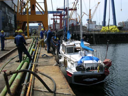 Levantan con la grúa el barco 3 palmos para poder trabajar por debajo y