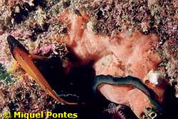 per barret, del tot closes; un congre (Conger conger) entre unes roques aculades
