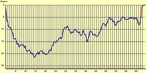 una forta inflexió i comença la cala adjacent. La fondària màxima fou de