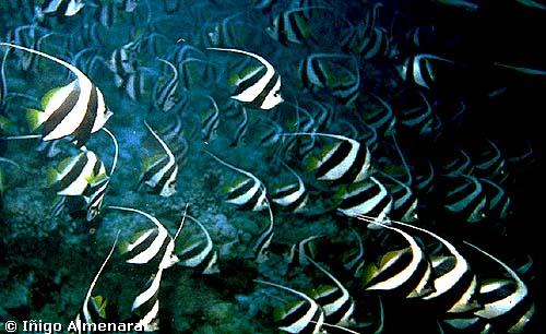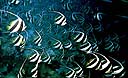 una multitud de Platax y de peces ángel se acercan hacia él. Están