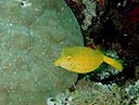 los peces payasos, un pez globo de color amarillo que nos mira con sus