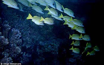un enorme cardúmen de pequeños peces. Se muestran totalmente indiferentes a