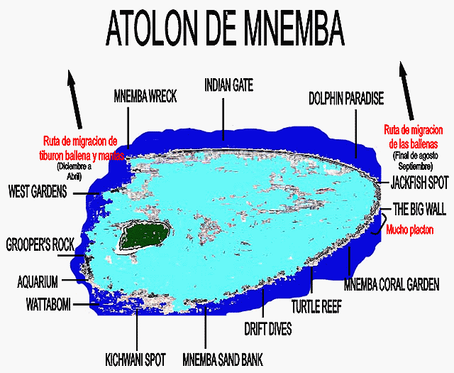 nombres, pertenecientes a las zonas de buceo del atolón de Mnemba, como