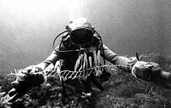 del ancla, o entre las redes de un pescador, o dentro de una bolsa de inmersión). Una vez