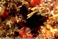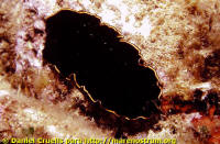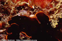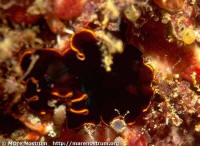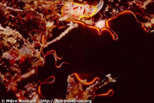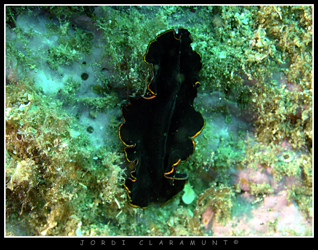 Más Fotos Descripción Pseudobiceros splendidus tiene el cuerpo alargado, alcanza hasta unos 60 mm. de longitud, y su forma general es ovalada, redondeada en los extremos, y de textura lisa. En aguas mediterráneas el animal tiene color negro o violeta muy oscuro, mientras que en aguas Atlánticas parece que el color de base es marrón, más o menos oscuro, pero siempre con una banda de color naranja o amarillo situada alrededor del cuerpo y bordeada en color oscuro por la parte exterior. Tiene un abultamiento dorsal bien formado a lo largo de todo el cuerpo. La parte inferior del cuerpo es de color gris azulado. En la parte frontal tiene dos tentáculos bien definidos, de extremo apuntado y abultados en la base, formados por un pliegue del borde delantero del cuerpo. Tras ellos dispone de varios grupos de ocelos –órganos visuales– dispuestos en forma de herradura y que permiten al animal orientarse en función de la luz que percibe; generalmente huyen de la luz intensa. Como los otros miembros del suborden Cotylea, dispone de una ventosa situada un poco antes de la parte central del cuerpo, justo tras el orificio sexual femenino, que le permite fijarse al substrato en condiciones adversas del medio, como corrientes de marea, temporales, etc. Como todos las planarias, este animal es hermafrodita (macho y hembra a la vez). Dispone de un órgano de copulación masculino doble situado algo por detrás de la faringe y dirigido hacia delante. El aparato sexual femenino tiene úteros ramificados. Pero su estrategia de supervivencia no se basa solo en la reproducción; las planarias tienen una gran capacidad de regeneración: un animal puede reconstituirse a si mismo a partir de un pequeño trozo. P.splendidus es un animal que se arrastra vivamente por el fondo marino y que también tiene cierta capacidad para nadar mediante ondulaciones sincronizadas del cuerpo. Se le encuentra a poca profundidad, siempre sobre rocas pues, como todas las planarias, tiene dificultad para desplazarse sobre fondos blandos. Se le considera escaso. El animal está poco estudiado. Se creía que era endémico (exclusivo) del Mar Mediterráneo, pero durante nuestra búsqueda bibliográfica hemos encontrado numerosas citas en el Océano Atlántico africano así como en aguas australianas. En nuestras aguas puede confundirse a simple vista con otra planaria de dimensiones relativamente grandes, la Pseudoceros velutinus, de la que se distingue por la banda naranja alrededor del cuerpo, fácilmente visible en P.splendidus y, según la bibliografía, solo aparente bajo lupa binocular en P.velutinus. Ésta última especie dispone también de unas manchas blancas características entre y detrás de los tentáculos, correspondientes a los ocelos cerebrales. Clasificación Orden: Polycladida Lang,