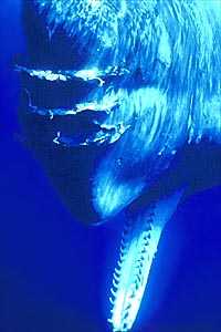 El momento más emocionante fué cuando liberamos la red que aprisionaba la cabeza y el animal abrió la boca y se giró hacia Lucía y hacia mí. En ese momento no niego que pensé en que podía devorarme de un bocado, y yo con el ojo pegado al visor de mi cámara para encuadrar esta espléndida escena... El cachalote abrió su gigantesca boca de forma extredamadente lenta, como si diera un enorme bostezo. Yo estaba de lado, pero recuerdo como en una película, que luego fotografié, la gran boca abierta a contraluz. Entonces el animal giró su cabeza hacia nosotros y nos miró; sentí como si quisiera darnos las gracias. Tuvimos que inventar una técnica para cortar la red y liberar así al cachalote; decidimos empezar por la cabeza, cortando la red de forma que protegíamos su piel interponiendo nuestras manos para no dañarla más (aunque hubiera sido más útil emplear esas tijeras quirúrgicas con las puntas redondeadas).