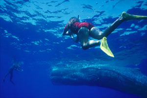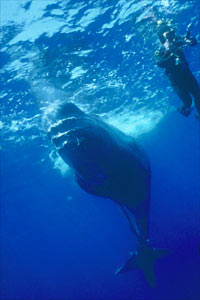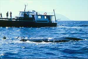 Mi mujer Lucía y yo habíamos embarcado en el bonito yate "Maria Gabriella" en compañia de otros buceadores y del director de la revista Franco Capodarte; en los dias anteriores habíamos completado el reportaje terrestre y submarino de Alicudi y Filicudi y nos dirigíamos hacia Lipari cuando escuchamos en la radio un mensaje que informaba del peligro para la navegación que representaba una ballena atrapada en unas redes que iba a la deriva en el estrecho que separa las islas de Lipari y Salina. Entre que nos miramos a los ojos y decidimos buscar la ballena pasó tan sólo un momento, tras el cual pusimos rumbo a la zona señalada. Las indicaciones eran muy vagas así que necesitábamos mucha suerte para encontrarla, pero ¡teníamos que intentarlo!. Despues de algunas horas de búsqueda infructuosa estábamos desmoralizados y casi sin combustible, por lo que decidimos volver a puerto para repostar y seguir buscando al animal. Justo en este momento uno de los vigías, apostado en lo alto del puente con unos prismáticos gritó: "¡Sopla!" al igual que los viejos balleneros.