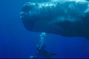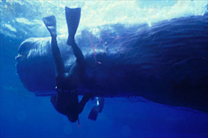 Hasta ese momento creíamos que se trataba de una simple ballena, una criatura inofensiva y desdentada, pero en cuanto me acerqué por debajo del agua me llevé una desagradable sorpresa: reconocí la inconfundible silueta de un cachalote, como el terrible Moby Dick del Capitán Akab, armado de enormes dientes como los de un Tiranosaurio y preparado para devorarme. ¡No podríamos liberarlo! ¡Era demasiado peligroso! Mientras pensaba todo esto, tomé algunas fotos antes de volver al barco para informar a mis compañeros que todavía ignoraban la verdadera identidad de la ballena. Todos coincidimos en que era extremadamente peligroso intentar liberar a un "monstruo" de este tipo. Además no teníamos noticias de ningún otro contacto directo entre cachalotes y buceadores, aparte de las terribles historias de balleneros del libro de Melville. Ni siquiera sabíamos que había cachalotes en el Mediterráneo.