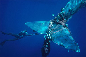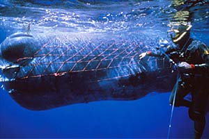 No queríamos creerlo, pero al cabo de un momento vimos otro soplido, ¡ y justo enfrente de nosotros!. Parecía un escollo en medio del mar (pero estábamos a varias millas de la costa), que estaba tranquilo, sin olas, bajo un sol cegador. Nos acercamos lo más posible y vimos claramente que la ballena se había enredado en una red de deriva ilegal, de las que todavía se emplean para capturar peces espada. La ballena respiraba a un ritmo muy lento. La parte emergida era mínima comparada con la sumergida pero aún así se adivinaba que era un animal muy grande. Decidimos liberar al animal y documentarlo todo, así que me sumergí con mi mascara, mis aletas y mi cámara para hacer un primer reconocimiento mientras los otros preparaban el equipo.
