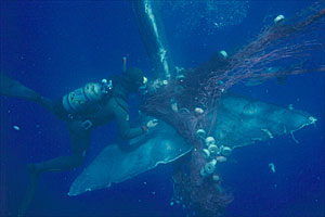 Así conseguimos liberar simultáneamente los dos lados de la cabeza y buena parte del cuerpo. Entonces la red se enganchó en la pequeña aleta dorsal, pero en este punto Piero saltó a caballo del animal y cortó la red, mientras nos dejaba de piedra. En este punto observamos que se había formado un nudo enorme en la base de la aleta caudal, y no resultaba fácil cortarlo, por el movimiento contínuo de la aleta que nos desplazaba varios metros arriba y abajo. Además teníamos el problema añadido de tener que compensar continuamente. Por eso, decidimos bucear con botellas tan sólo para liberar la cola del cetáceo.